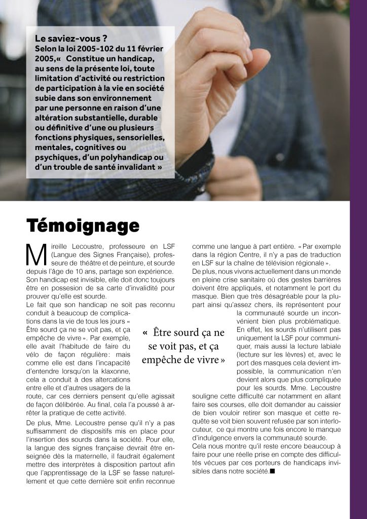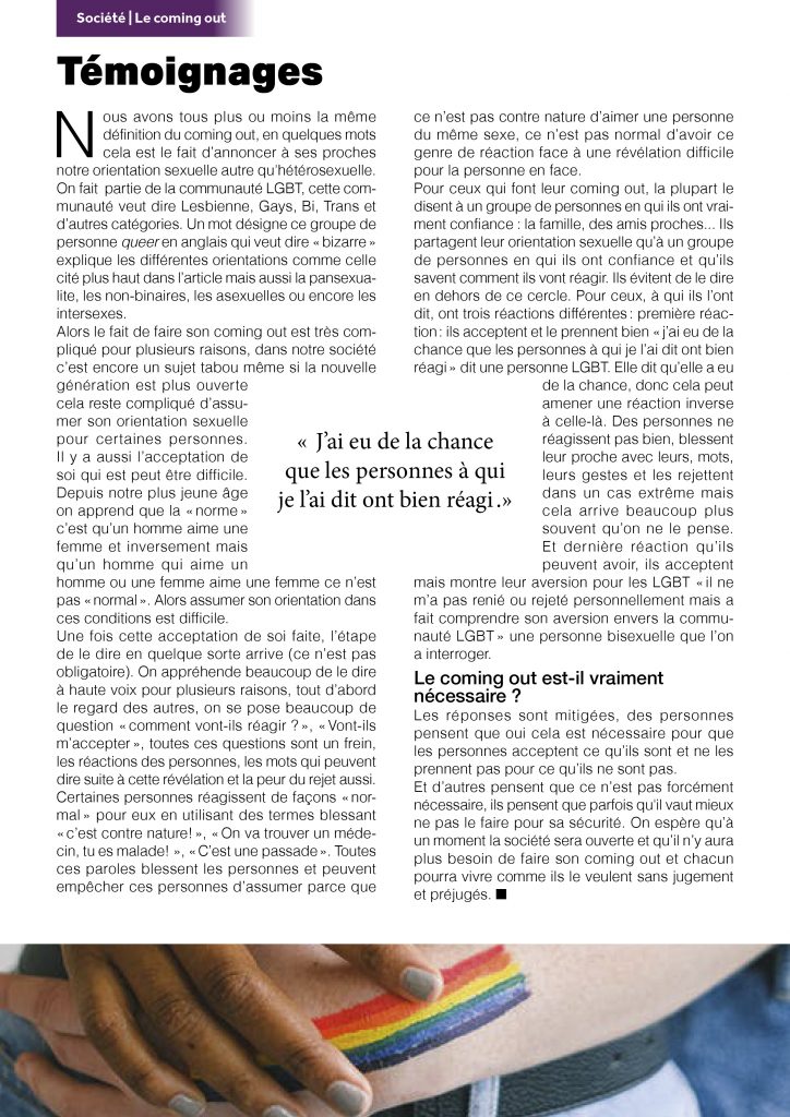 En projet de classe, nous devions faire un magazine. Nous devions trouver le nom, les rubriques (Sport, Mode, Voyage, Cinéma, Technologie et Société), faire toute la charte graphique, une fois tout ceci fait. Nous nous sommes divisés et repartîmes en petit groupe pour chaque rubrique. Mon groupe et moi avons décidé de choisir la rubrique société. Ensuite nous devons réfléchir aux thèmes que nous voulons aborder, nous avons choisi de parler du Coming Out et de la langue des signes. Puis une fois la rédaction des articles finis, il fallait faire toute la mise en page des textes et des photos.