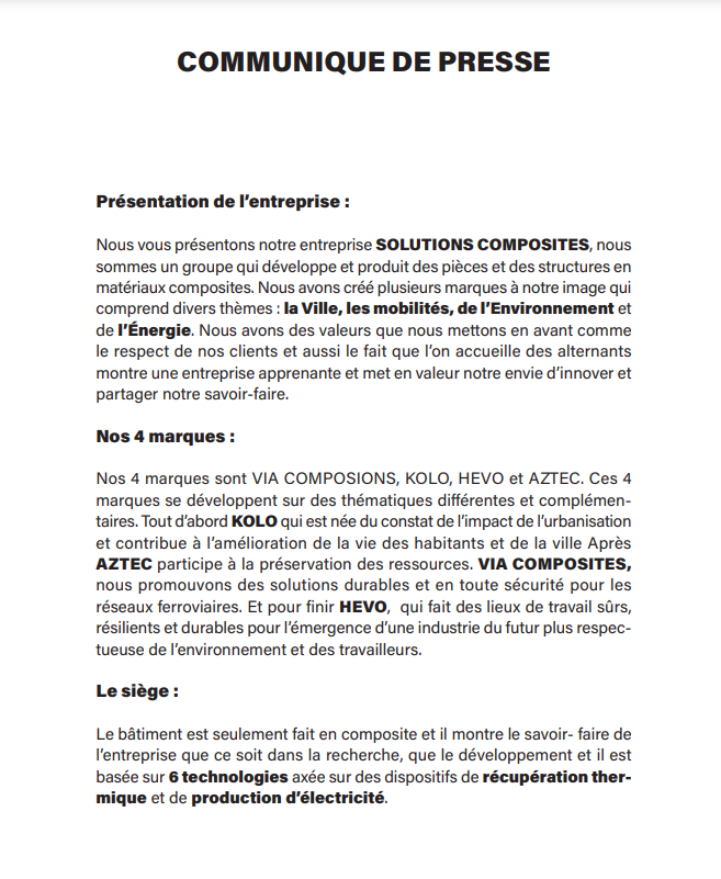 La semaine avant les vacances, nous avons une semaine spéciale : une semaine de challenge. Nous avons eu comme défi de réaliser un dossier de presse et un communiqué de presse. A gauche, voici le communiqué de presse et le lien renvoie au dossier de presse.